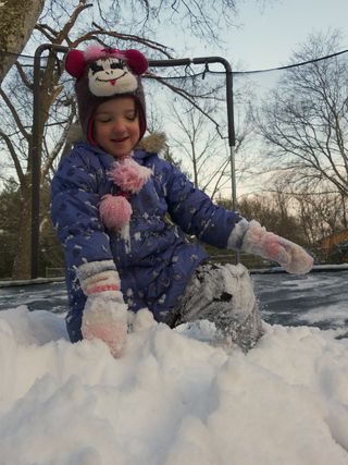 Then we started jumping on the trampoline in the snow! We noticed that the snow was starting to collect in the middle of the mat, so I promptly got the broom and helped it grow. Then we gathered in the middle and enjoyed playing in our 6" of snow! It was a dry snow, so no snowmen this time.
