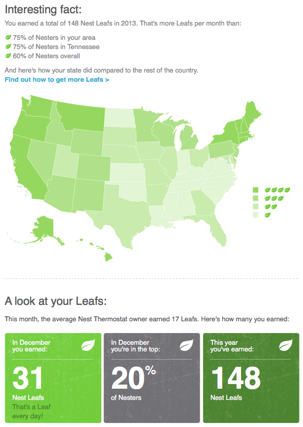 So that is the lead-in to Nest [Yes, the Nest that was just purchased by Google]. Have I told you I love my Nest Thermostat? I won’t bore you with its amazing features, but right now I’m enamored with their monthly energy reports. Here’s my latest: