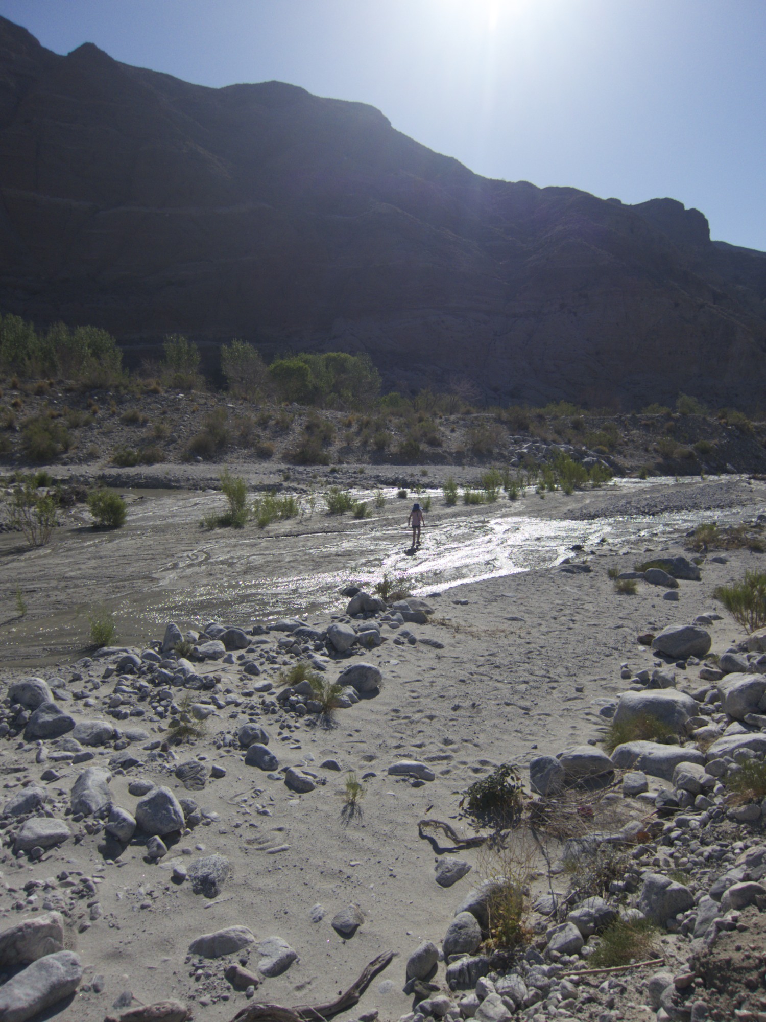 In my time on the West Coast, I came to enjoy the desert and the long vistas, the severe beauty, and the solitude that can be found there. So in our planning I chose to do our adventure trip in the desert while visiting Grandpa Hill and Grandma Beth. We rose early in the morning, before anyone else was up, and headed for a small place called Whitewater. It’s up towards the San Gorgonio Pass and its windmill farm, which is fascinating enough for a small child, and while the road looks flat, it’s quite a climb from 200 ft. in Palm Desert to 1500 ft. in Whitewater. The elevation change makes it just a bit cooler when we get there at the 8:00 opening of the gate.
