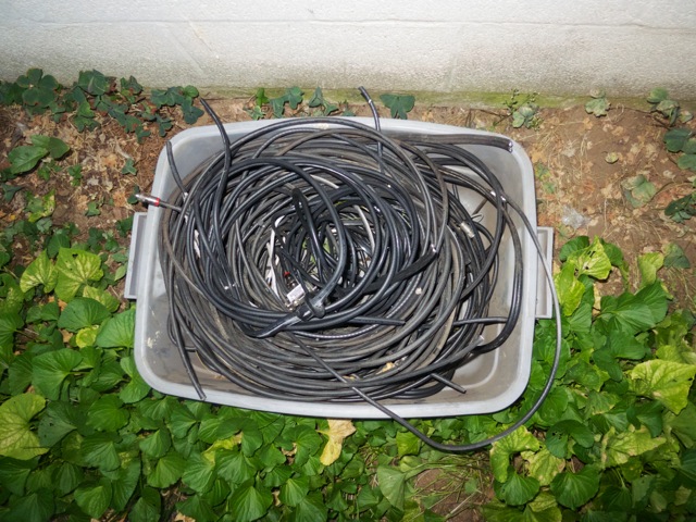 While I was in kneepads, I also started cleaning up the excess wiring under the house. Years of cable TV, Direct TV, and whatever else had created a spaghetti-like maze of coax cable all through the house. Once I was done underneath, I had to finish the task by cleaning up the wiring outside the house and upstairs. Here’s the 20 lbs of wiring that I eventually got out.