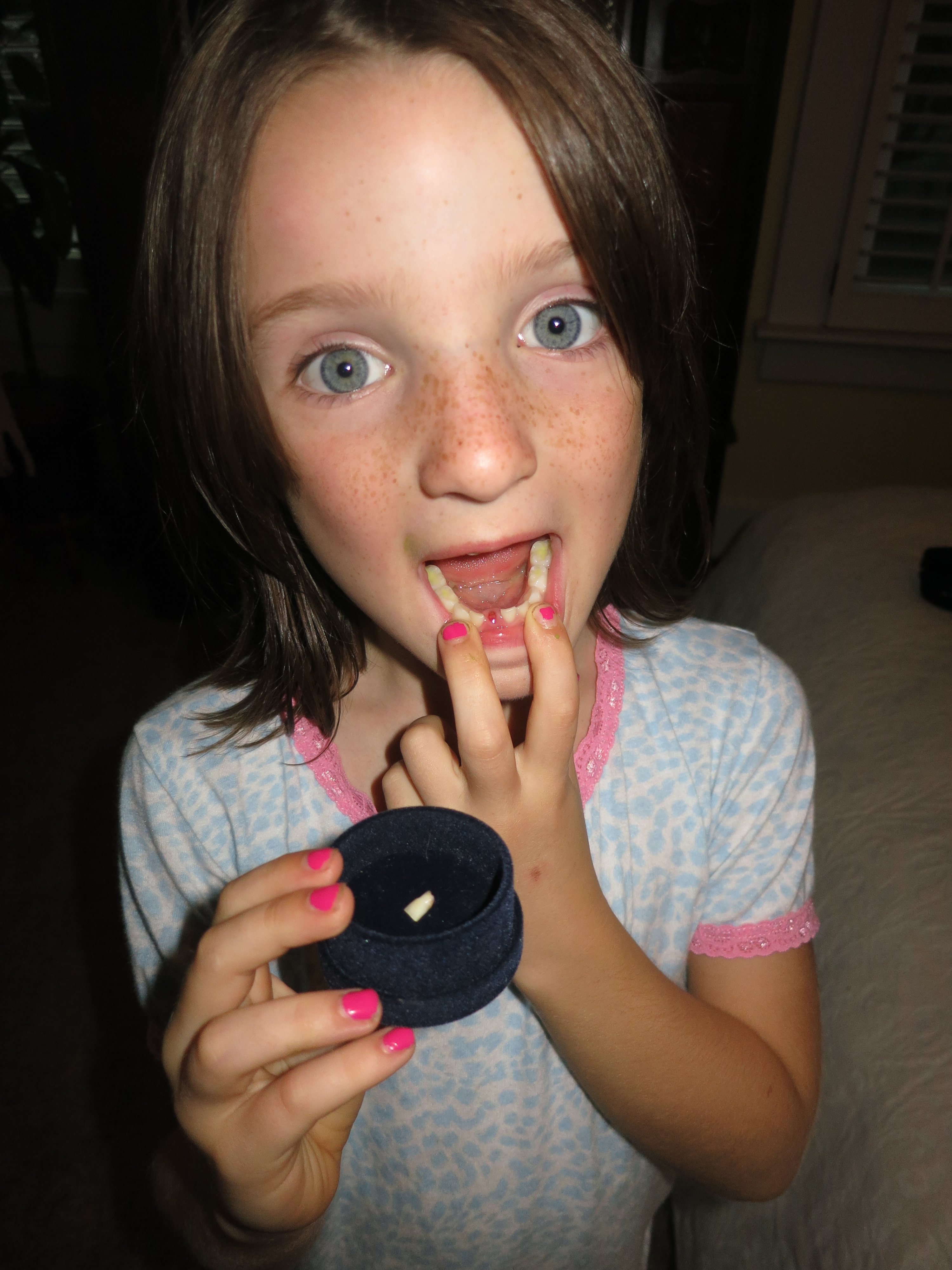 I’ve never seen anything else make my girl so happy. She finally lost her first tooth at dinner last night after enduring a drama-filled five days learning that losing teeth is actually painful at times. It was our home group night, so she enjoyed showing off her new found treasure to everyone. Repeatedly. And again. Did I tell you how happy she was?