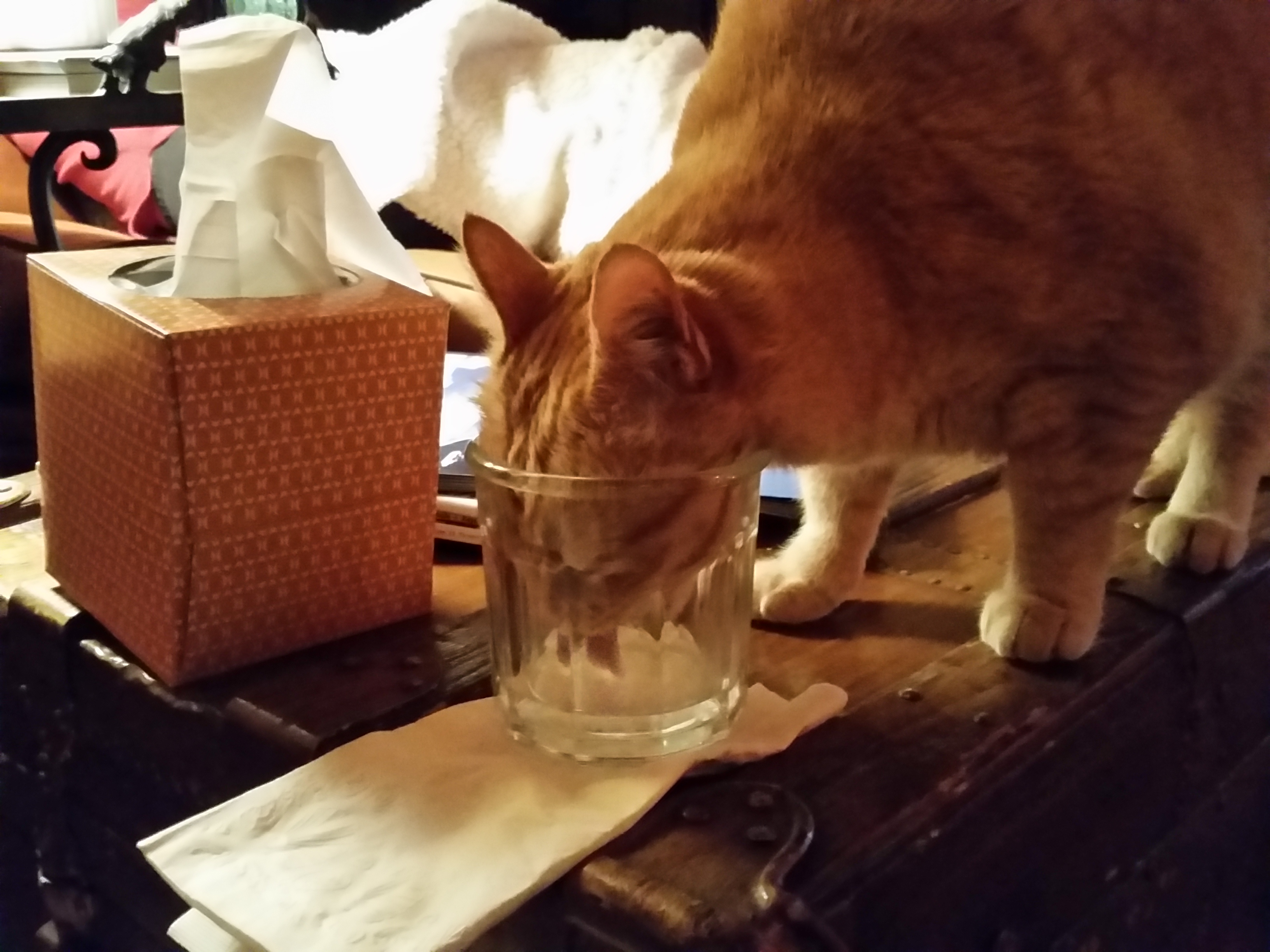And Butter the cat is continually finding things to amuse herself with, including carelessly left behind drinks.