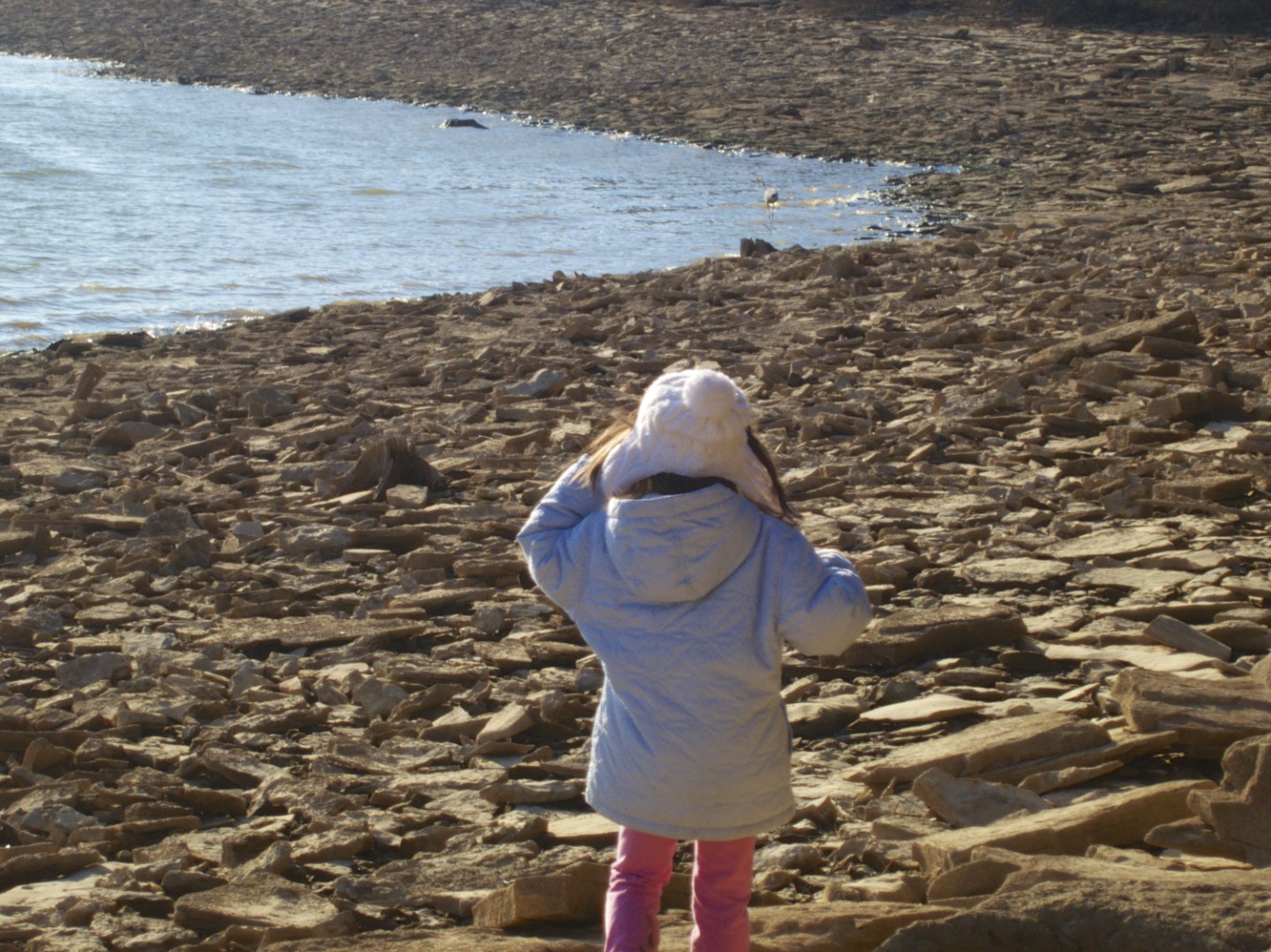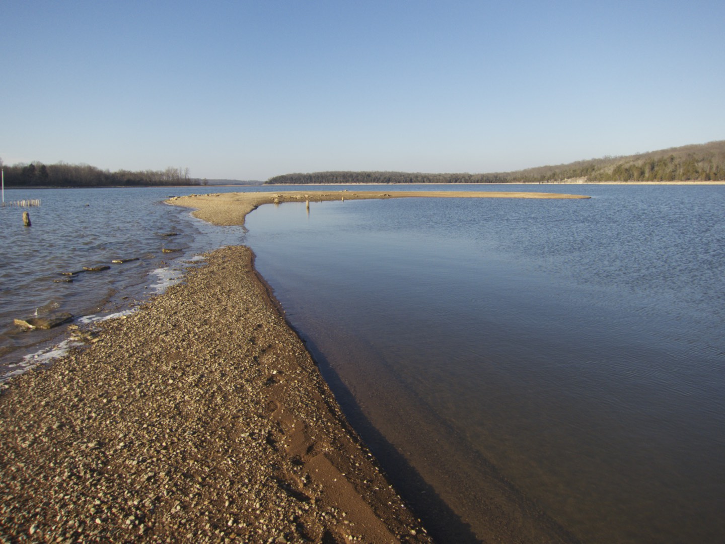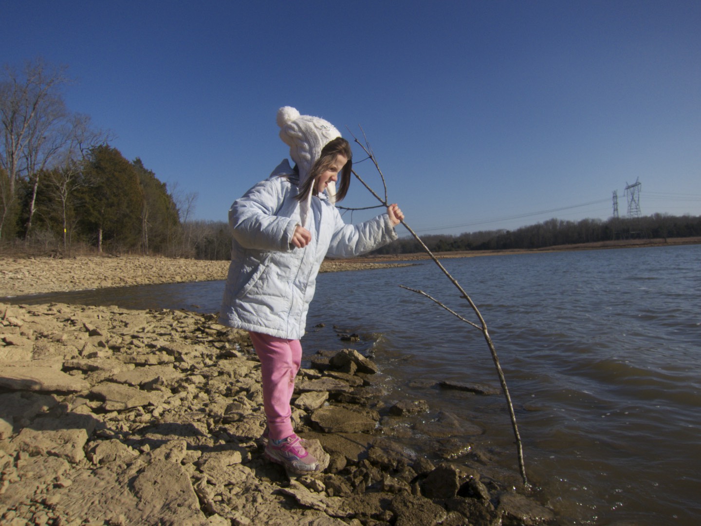 She eventually got tired of rock hopping, but right as we were going to head inland, we found the remains of an old road that was abandoned once the lake was filled. We hiked along the road while imagining what it might be. The asphalt was slowly being reclaimed by nature, giving it a strange surreal vibe. Was it a secret road to a hidden kingdom? A fairy path to the elves castle? An abandoned road that led to a long-lost civilization? I half expected to meet Frodo, but instead we ended up at our goal – the tip of a peninsula. In a curious state of water level, what we found was, in my experience, the closest thing to a beach experience in Tennessee.
