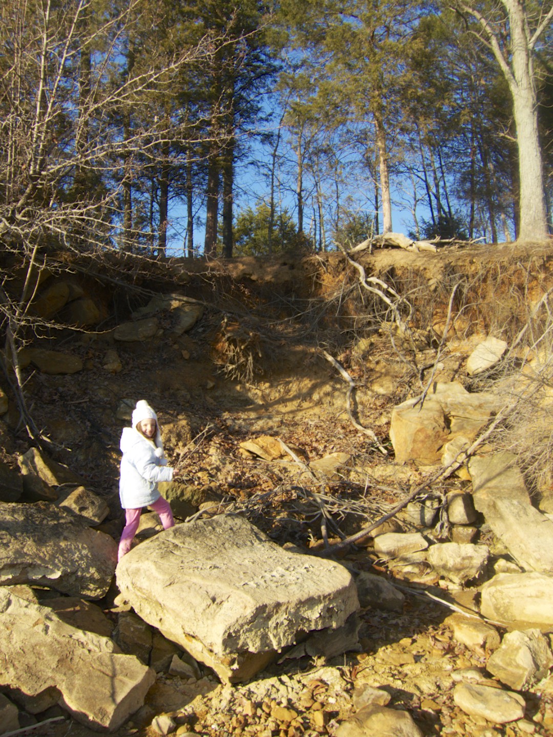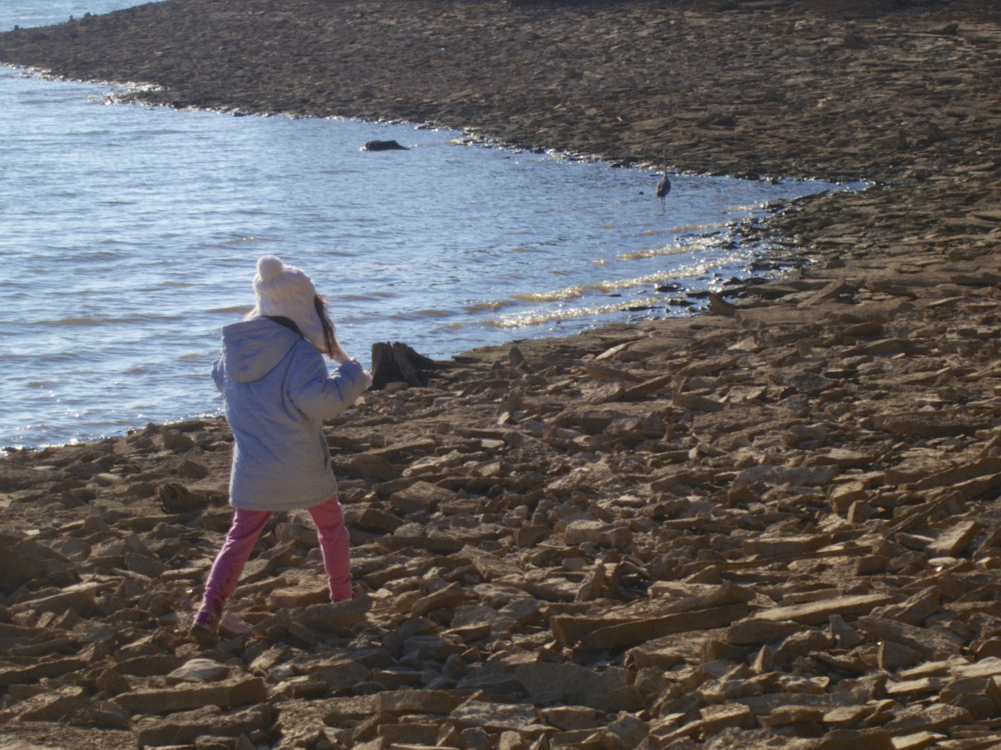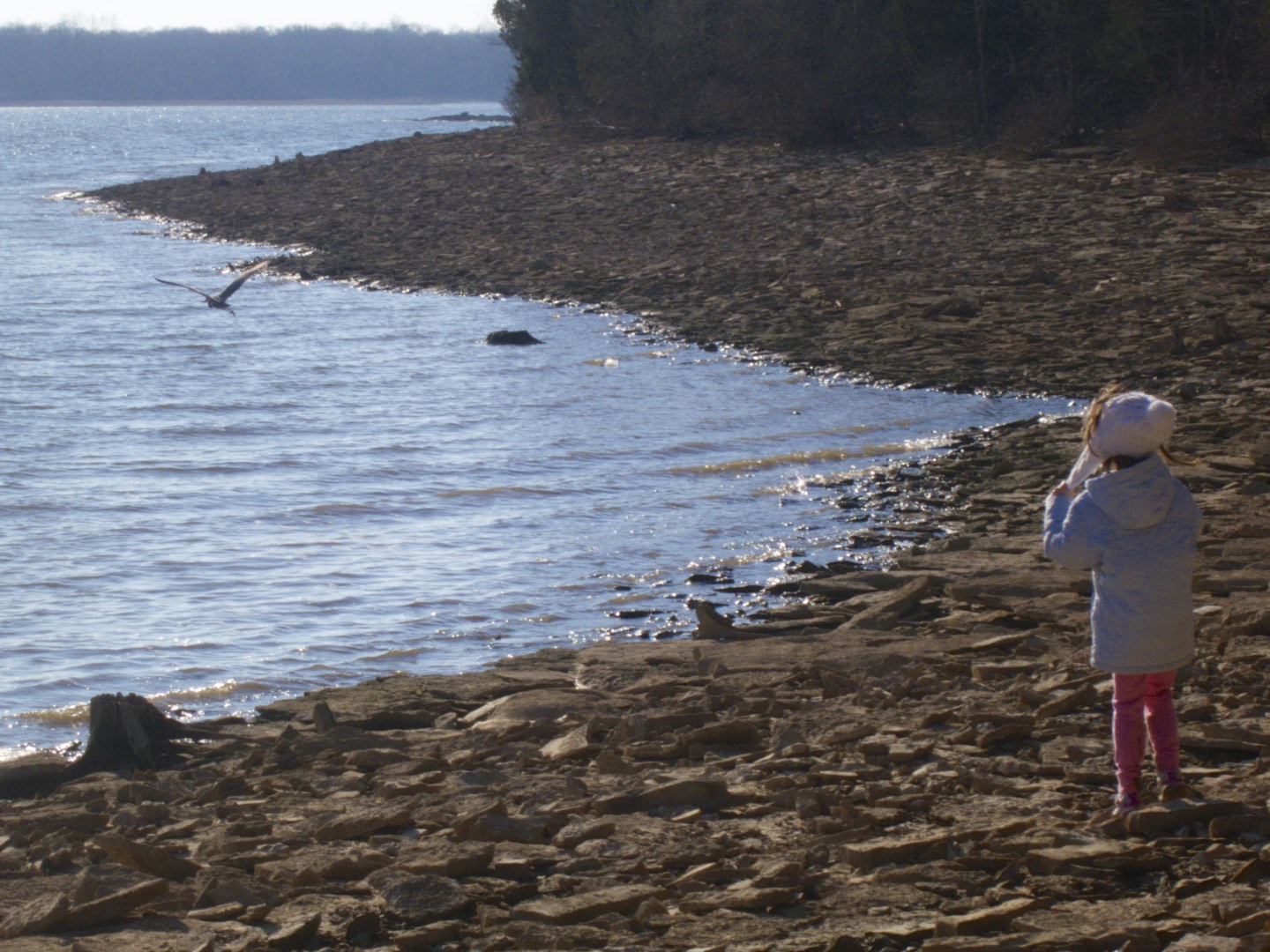 She eventually got tired of rock hopping, but right as we were going to head inland, we found the remains of an old road that was abandoned once the lake was filled. We hiked along the road while imagining what it might be. The asphalt was slowly being reclaimed by nature, giving it a strange surreal vibe. Was it a secret road to a hidden kingdom? A fairy path to the elves castle? An abandoned road that led to a long-lost civilization? I half expected to meet Frodo, but instead we ended up at our goal – the tip of a peninsula. In a curious state of water level, what we found was, in my experience, the closest thing to a beach experience in Tennessee.