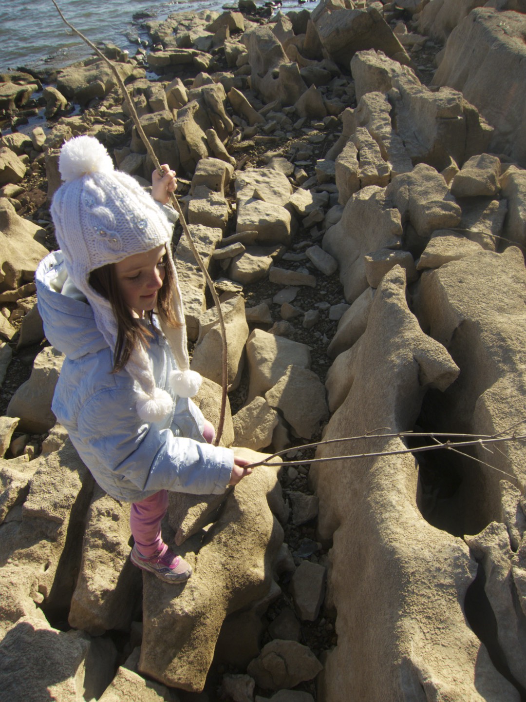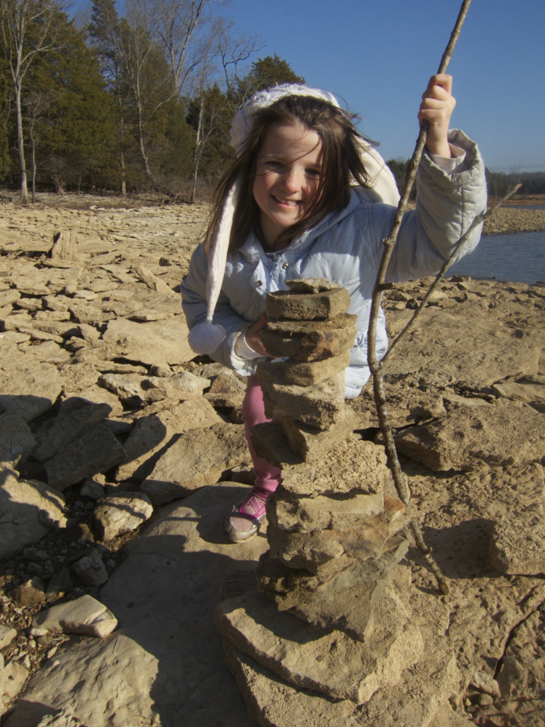 We scrambled along the rocky shore for a bit before stopping and building a cairn, or ebenezer. She is quickly learning how to select the flat type of stones that make for a sturdy tower!