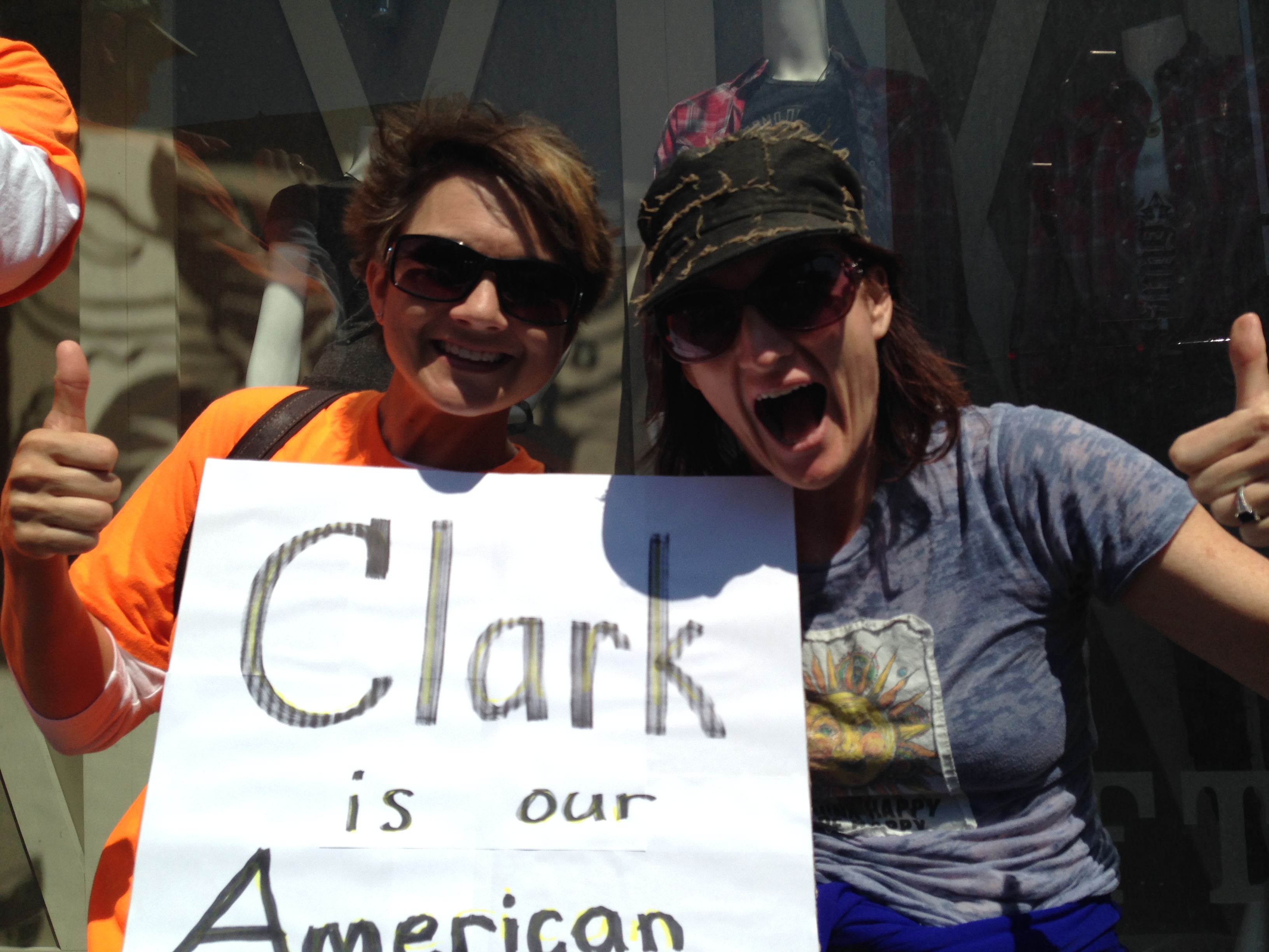 But wait, where is his guitar strap? Yes, the soon to be second place Idol had forgotten a strap for his guitar. So who volunteered to go grab one? My beautiful, thoughtful wife. She quickly hopped down and proceeded to get one from one of the nearby honky tonks and then got to hand it personally to Clark. Oh the joy!