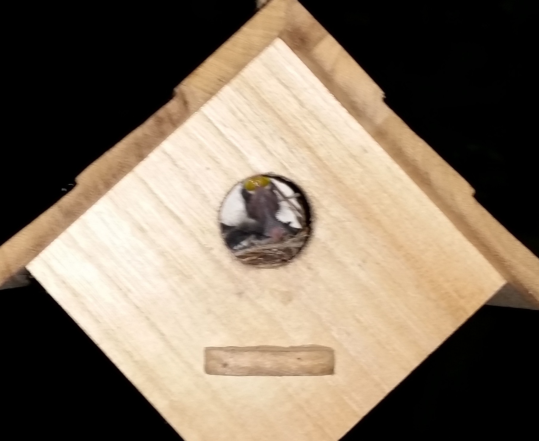 The eggs hatched around June 24th. I know this for two reasons – I started hearing the calls and kept watching the mama (and daddy) bring an amazing amount of insects to the house. I took one blurry picture of them on the 27th. You can only see one, but later we were able to see four baby birds in this small house.