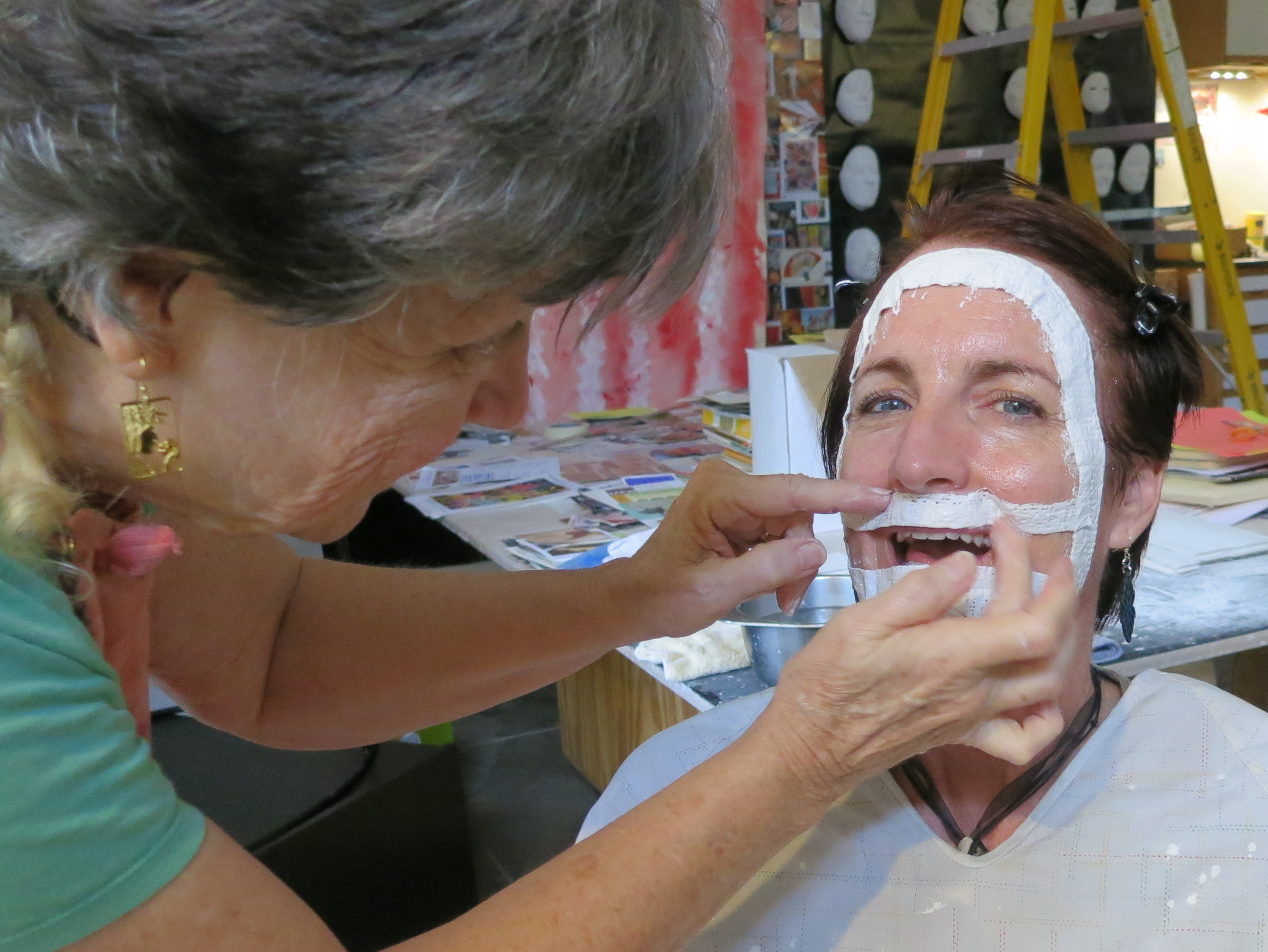We continued through Land Between the Lakes and eventually arrived in Paducah. We were staying in a room behind a gallery, and the gallery owners and hosts were absolutely delightful. They are retired teachers and have been in Paducah for ten years, initially moving here because of Paducah’s innovative Artist Relocation Program. Char is in the middle of a large art project that consists of making life masks – face molds of friends, family, neighbors, and in our case, guests. We are the adventurous sort and love art, so we quickly agreed to be “plastered.” Evie was first, though it was clear from her expression that she was not too sure about the process.
