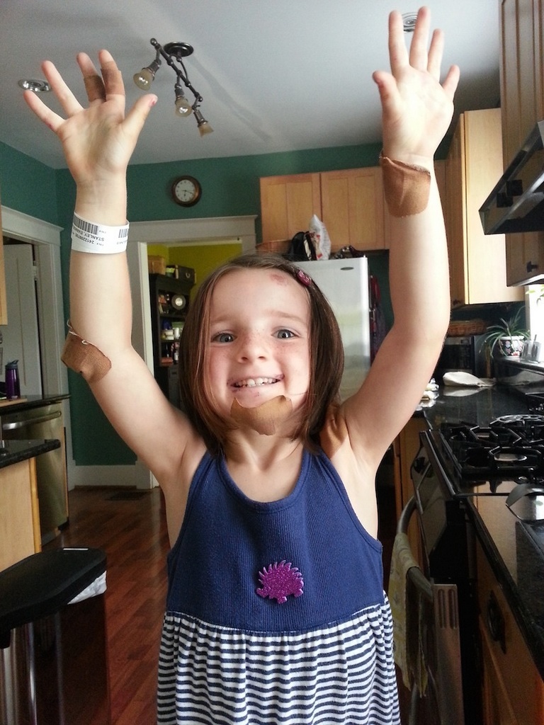 Lucky for her this happened before I started this blog or you would have seen the more gruesome pictures as well. She obviously survived and enjoyed having tons of bandaids for a while, but her fear of bicycling started that day. Ever since then, bicycling is something that she only does when daddy gives her no choice. She’ll whine and complain until she gets on the bike, then have a good time until it is time to go down a hill. Her memory of that crash must still be strong, so she still is very cautious about going too fast down a hill.